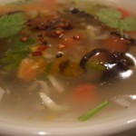冷たいものは温かくならないよと中国料理屋さんが作ってくれた温かいスープ。ほんのり生姜味と唐辛子。汗が出てスッキリ。なるほど涼しい