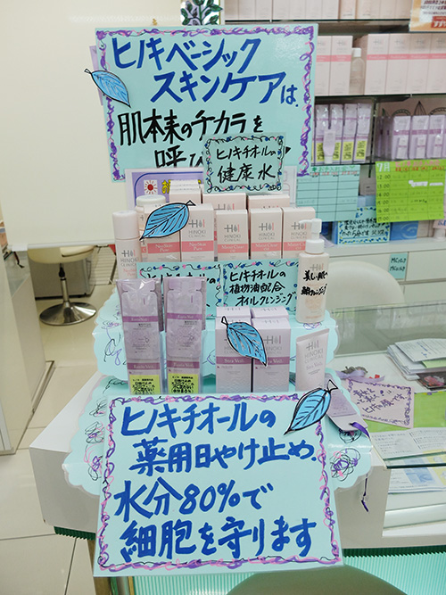 お店のおばあちゃまに ヒノキシリーズの日焼け止めクリームと化粧水を試しに塗っていただきました。