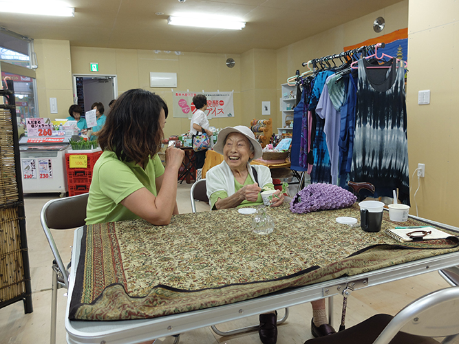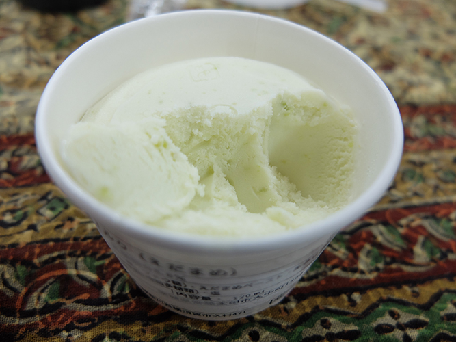 商店街で買物をすませた、おばあちゃんが「また来たわー」と枝豆アイスクリームを買ってほっとひといき、お店の人と世間話。なごやかな空間です。