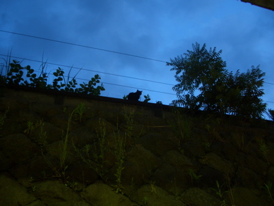 沈む太陽の反対側の真っ青な空に、草花とクロネコのシルエット。行き交う人たちを観察していました。