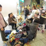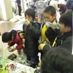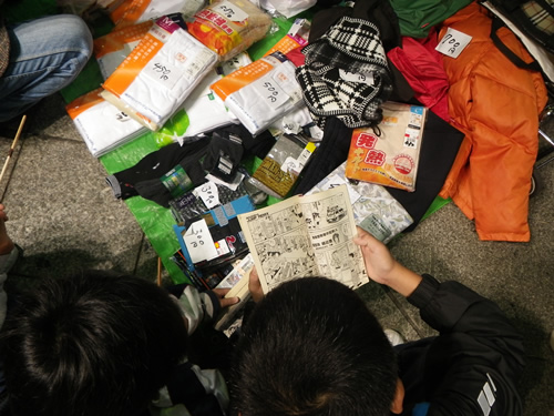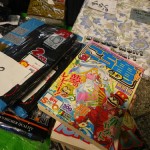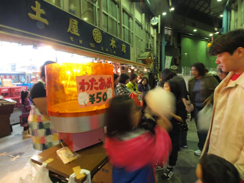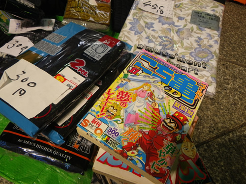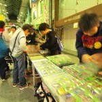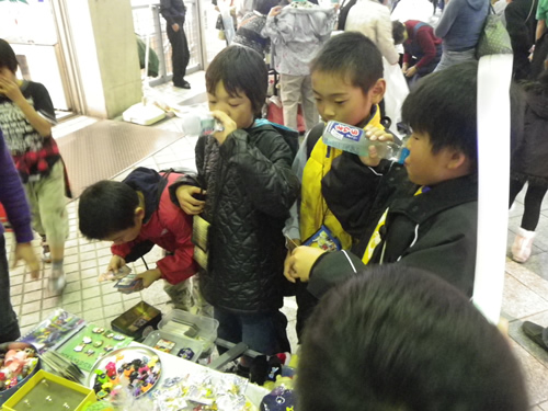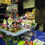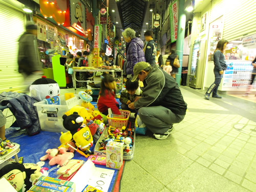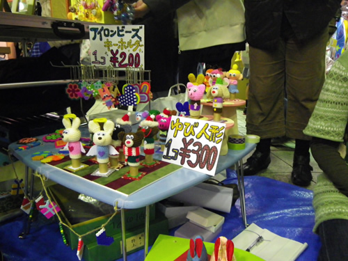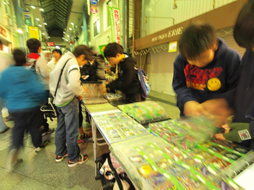 フリマや夜店、パフォーマンスイベントの紹介とか 歩く所が狭いから気をつけてね とか商店街のアナウンスが流れています。細やかです♪10円!100円!半額!という呼び声も響きます。衣笠商店街のナイトバザールのフリマは個人出店が多いのだ♪だから掘り出し物いっぱい。工夫をこらした手づくりのブースで指人形、ポーチ布、サンダルにアクセサリーなども面白いものが多く見られました。対戦カードとゲームのブースは男の子に大人気!(しっかし今日は男子率高かったなぁ〜)