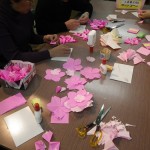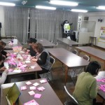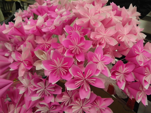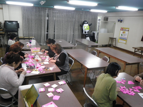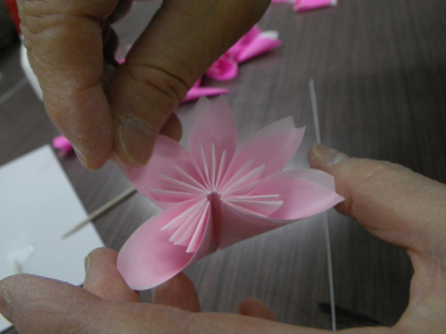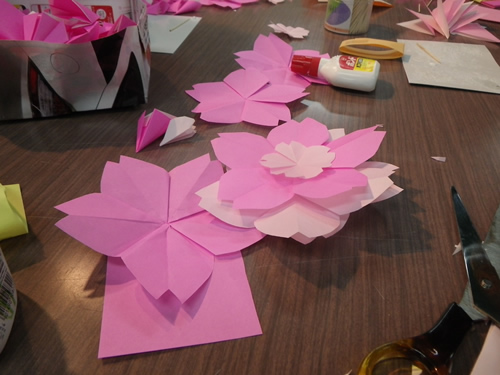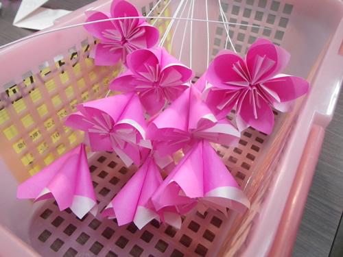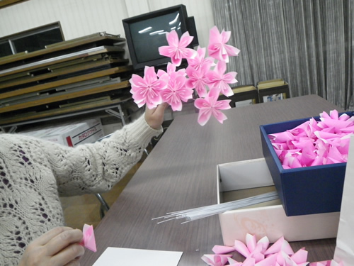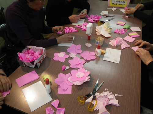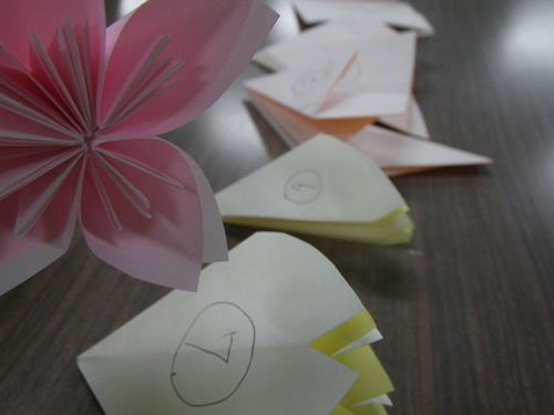 衣笠商店街の女性の会主催「桜のおりがみをみんなで作る会」は今日で3回目、曜日まちまちの全4回。同じ曜日だと来たくても来れないお店の人もいるでしょ?って。前回の曜日に来られなかった私にも これがありがたかった。