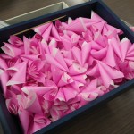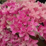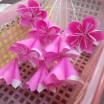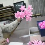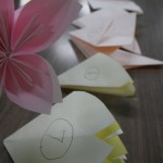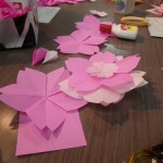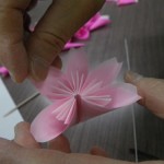 1辺8cmあまりの小さいおりがみを折って、くるりとまるめて ひとひら。5つ分の ひとひらを 木工用ボンドで重ね ふわりとさせて はい。できあがり!たいへんだ。一輪にずいぶん時間がかかるのだが、このフワリとできあがりのなんともいえない達成感がきもちよいったらない。