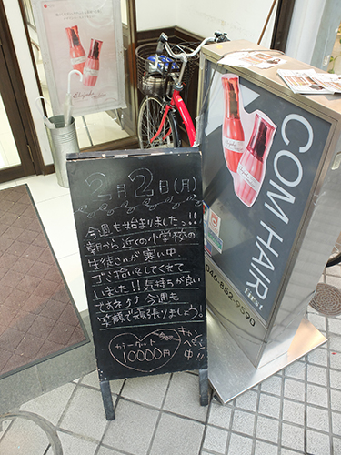 美容院 コムヘアーさんの手書き黒板。毎日書いているんですって